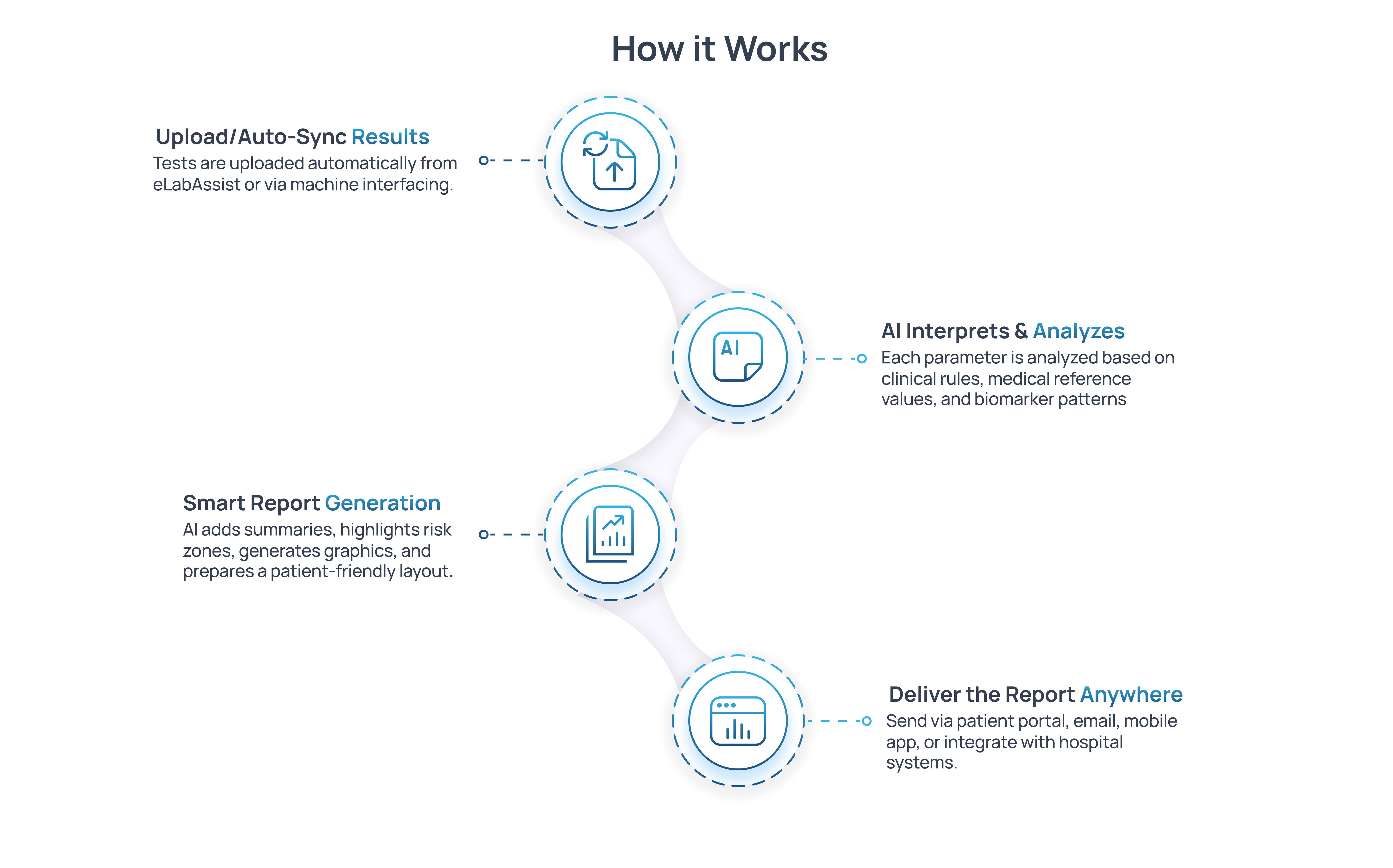 eLabAssist Smart Reports enhance traditional lab reports with AI-driven analysis and intelligent visualization. The system evaluates patient biomarkers, identifies critical values, flags abnormalities, and presents insights in a clean, easy-to-understand format helping labs deliver more informative, patient-friendly reports with greater confidence.